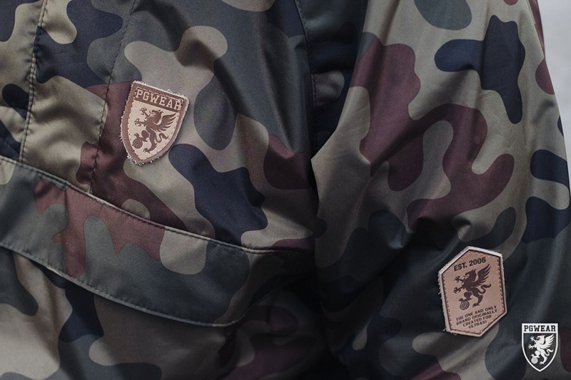 Nepromokavá bunda (maskáčové barvy) značky PGwear s kapucí, kuklou, přední kapsou a bočními kapsami, které jsou rovněž na zip. Na fotografii je bunda velikosti M focená na muži vysokém 178 cm.